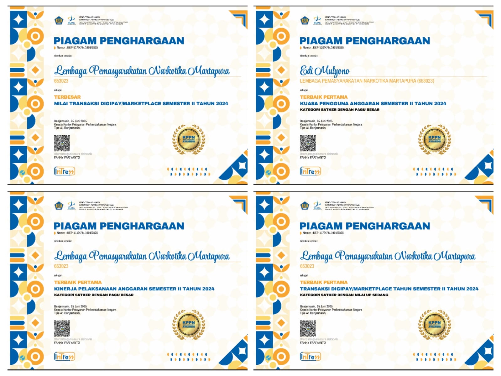 Piagam penghargaan diserahkan secara simbolis dan diumumkan setelah seluruh rangkaian rapat virtual yang diikuti oleh satuan kerja mitra KPPN Banjarmasin. Keempat penghargaan tersebut menjadi bukti nyata komitmen Lapas Narkotika Karang Intan dalam menjaga integritas, transparansi, dan akuntabilitas pengelolaan anggaran secara berkelanjutan.